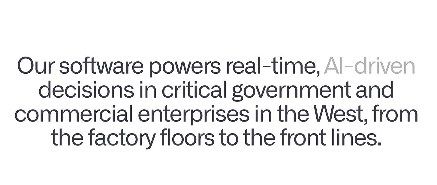 La frase nell’immagine qui sopra è come Palantir si presenta sul proprio sito. Come è chiaro dai riferimenti militari, Thiel e Karp non hanno mai rifiutato di cooperare con il governo statunitense in quell’ambito, anzi, la loro filosofia si basa proprio sull’idea di una Silicon Valley determinante per la supremazia militare degli U.S.A. e non più come solo strumento economico rivolto al mercato consumer.